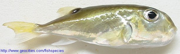 Green Rough-backed Puffer Rough Golden Toadfish* Lagocephalus lunaris Tetraodontidae [Puffers] 12.4 cm[max to 45 cm SL] 3.1 cm 50 gm Marine, brackish Of no commercial interest Yes, this fish was found at Bedok Jetty on 1/10/03 Demersal Golden green dorsally with prickles, white ventrally. Tail fin lunate. Dorsal spines:0, rays:11-13 ; Anal spines:0, rays:10-13 POISONOUS to eat. *The local name may be called a 'toadfish' but don't be confused with the actual toadfish species. This fish is still a pufferfish classified under the 'puffers' family. |