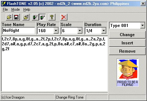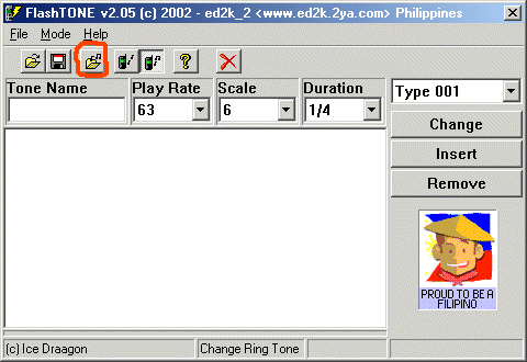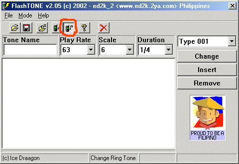 กดปุ่ม Insert เพื่อนำเพลงเข้าสู่ File ชื่อ Tone Name จะปรากฏที่ Box ด้านบนขวาแสดงว่า Insert File เรียบร้อยแล้ว ในกรณีที่ต้องการเพิ่มเพลงอื่นๆให้ทำขั้นตอนนี้ซ้ำจนกว่าจะพอใจ เพลงใดไม่ต้องการสามารถกด Remove เพื่อเอาเพลงออกได้เมื่อพอใจแล้วก็ Save File เพื่อทำขั้นตอนต่อไป "แยก Ring Tone" ครับ