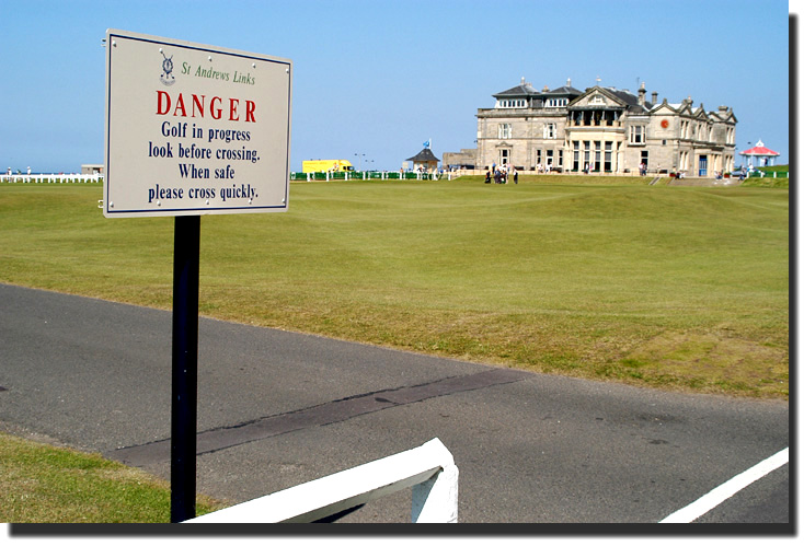 I took this photograph just after departing my hotel (Rusacks). For those who have never been to The Old Course at St. Andrews, there is a road called Granny Clark's Wynd that crosses the 1st and 18th fairways. Cars and pedestrians can cross this public course, but must do so respectfully and at their own peril. I thought that the combination of the sign and the Royal and Ancient clubhouse yielded a photo that passes along the feeling of respect for the ancient roots at The Old Course (at least for golfers!).
