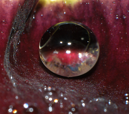 This is a macro photo of raindrops on a portion of a Pansy petal. Using lens reversing rings allows for amazing close-up photography and can reveal subtleties hidden to the naked eye.