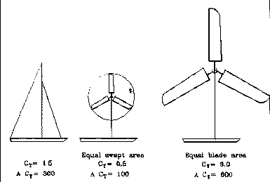 Another big advantage is that reefing the turbine to reduce the forces in high winds does not involve having to reduce the blade area. There is none of the usual bother of having to change to a smaller sail involved. The thrust force depends on area times thrust coefficient.