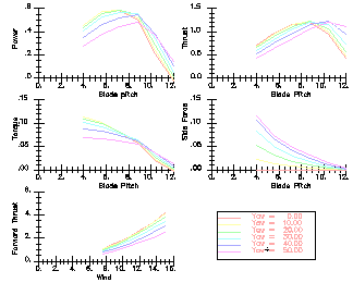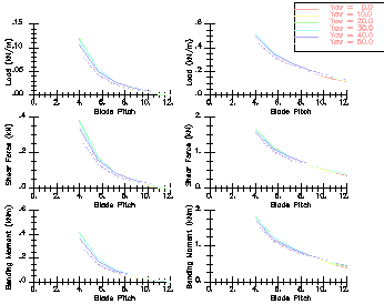 These are the loads, forces and bending moments along any blade, in-plane (left) and out-of plane (right). As you can see, the yaw angle has very little effect on these, as the loads are due largely to the high rotation and not so much to the oncoming wind. Turning your turbine at an angle to the wind does not put nearly so much stress on it as you might suppose.