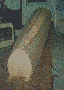 Photo 5 shows strip-planking the deck of the plug. Note that the lower part of the hull has been filled and sanded and noseblock added. Prior to this the strips were faired and covered with one layer of fibreglass/epoxy cloth to arrest shrinkage of the timber. I have included the plug photos to show that this hull could be striplanked in stead of fibreglassed. I could supply the fibreglassed noseblocks which would simplify this process.