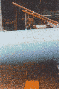 7 - The spade rudder in the up-position. In the down-position the square-section rudder shaft is lowered and engaged into a corresponding square key-hole in the fin tube. The fin is retained by a cord which passes up through the rudder shaft to a jamb cleat on the tiller.