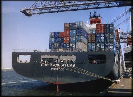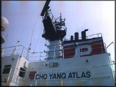 The Cho Yang Atlas, along with several of her sister ships, including the Cho Yang Alpha and the Cho Yang Ark, ply the high seas on what is know as "The Pendulum Route". The eastern end of the pendulum is Los Angeles, the western Hamburg, Germany, a voyage of about 18,500 miles, that takes about forty days. I boarded in Los Angles and disembarked in Hamburg, though there were three other passengers who took segments of the voyage. The Atlas is a 4,500 T.E.U* container ship that has been in service since July of 1997, under charter to the Cho Yang Shipping Company, LTD, (HK). While not the largest container ship in service, an idea of its size can be gained by comparison with the Titanic. The Atlas is 964 feet (294 meters) compared with the 882.5 of the Titanic. The Atlas has a displacement tonnage of 82,496 metric tons, the Titanic, 66,000. Both could move through the sea at speeds up to 25 knots. While the Titanic was capable of carrying 2,433 passengers, the Atlas carries a mere 8 maximum, in four cabins on "D" and "E" decks. Three cabins have side views, one with a forward facing view only. This cabin was on the "D" deck. The others also have either fore or aft views. As you might expect, the forward and aft views on "D" deck were blocked by containers when stacked more than five high on either the forward or aft decks. Like most freighters, there was no elevator. While there were no elegant dining rooms, smoking rooms and libraries found on the Titanic, the Atlas can boast of its wet sauna, pool (inside "D" deck) and cabins with TVs VCR's and stereo A.M./F.M. radios, tape and CD players. She had a growing library of books in both English and German located in the officer's rec. room on the "E" deck, which also contained a large screen TV The officer's mess is located on the port side on the "A" deck, one deck above the ship's main deck. The crew's mess is one the starboard side, with the kitchen connecting the two. The food was a cut above the usual fare found on freighters. In fact, the Filipino cook somehow managed never to serve the same dinner/lunch meal twice. There were usually salads available at noon and evening meals. The assortment of cheeses and cold meats available at lunch and dinner would satisfy the pallets of most Germans. Deserts were limited to ice cream and calorie packed chocolate cakes with cream fillings. The pantry was always open for those passengers or crew who wanted a late night snack. Ice tea and ice water seemed to be unknown to the German crew, however, the steward quickly adapted to the needs of us American's who are used to cold drinks with meals. The Atlas, unlike many freighters, had walkways around the super structure on each deck with large open deck space on the "F" deck. These were adequate for sun bathing and allowed placement of deck chairs on the lee side of the ship. Even with a wind speed of zero, which was rare, placement of deck chairs was critical given the speed of the ship. However, residue from the engine was tremendous coating the deck, daily with a black soot. While this is to be expected with any freighter, the Atlas' 55,800 HP engine, disgorged soot in quantifies much greater then a smaller freighter with a 15,000-20,000 HP engine. This really became a problem as the decks were washed down only once during the voyage. To prevent tracking this residue in one's cabin, shoe removal was necessary least the carpet be ruined. Interior maintenance and appearance of the Atlas was excellent. I'm sure that the captain would have liked to have washed down all decks on a daily bases, however, with an on deck crew of about ten men this just was not possible (the total crew on board was only 20). The problem of outside maintenance was compounded because a module in the ship's steering computer failed, requiring the ship be manually steered by an OS or AB from the Red Sea to Le Harve. This meant that there was one less man for deck duties. The main deck was always dirty, excepting the fo's'cle. This was due in part to an inadequate deck crew and the design of the main deck, which had no "scuppers". This, coupled with the 2" deck edge, prevented the deck from being easily cleaned. I was advised that the absence of scuppers was to avoid dirty water from running down and staining the sides of the ship. I guess the "cost benefit" consideration was such that scupper installation was excluded in the ship's design. Oh well, this is a freighter not a cruise ship. A word about noise is in order. Big ships have big engines. Big engines require massive air intakes. These intakes are extremely noisy at just about any place on the port or starboard side of the super structure (outside). They were faintly heard even within my "E" deck cabin, though I may be hypercritical regarding this observation. As with all freighters, the quietest part of the ship was the fo'c's'le area. The Atlas, and all other ships of her size, is extremely stable. While we encountered no heavy seas during the voyage, a three-foot sea was not noticeable. Personally, I like a ship that is about 300 feet shorter so that a bit of pitch and roll is always noticeable. In the future I shall stick to freighters with a 1500 T.E.U. capacity, or less. If I want stability, I will sail on a cruise ship. An Atlantic crossing in the winter is more my style. As with all container ships, port times were short. The port city is not always close to where the ship docks. For example, the Port of Rotterdam is located 50 kilometers from the city; 20 kilometers at Le Harve. The Hanji pier, where the Atlas docks in Hong Kong, is located across the bay from the island of Hong Kong, though this presents no particular problem in getting to the City. The facility at Oakland is essentially in the middle of the San Francisco bay, at the end of the old Alameda Air Base, making accessibility to San Francisco rather difficult. Smaller ships dock close to Oakland and thus the city of Oakland and public transportation (