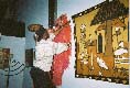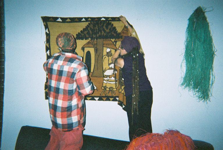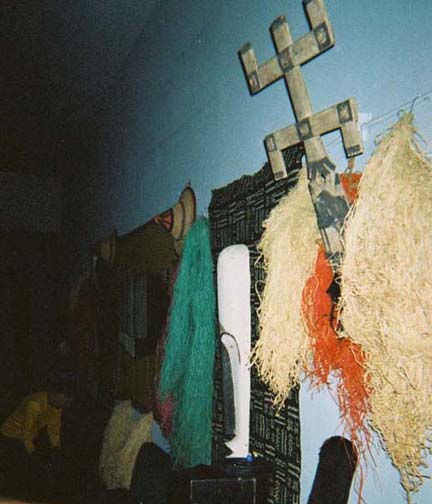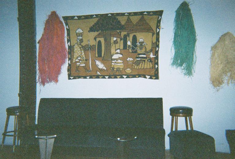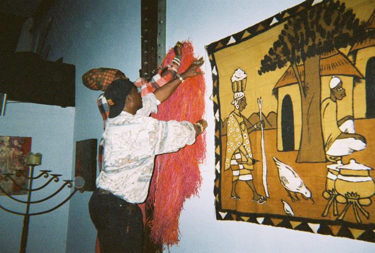 masks, wall hangings displaying village scenes, and a centerpiece featuring a