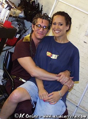 August 31, 2000. I thought I'd wrap up the month with a tiny bit of news about next year's film Fast Sofa based on the book by Bruce Craven. The news is bittersweet. Eric apparently has another small role with another outrageous hairdo. The movie stars Adam Goldberg, Jake Busey (Gary's son) and Jennifer Tilly. A Hollywood bartender falls for his best friend's girlfriend, a porn star, played by Jennifer Tilly. Jennifer's body double is real-life porn star, Asia Carrera, shown here on the set with Eric. There is another photo of Eric kissing her at Asia's website.