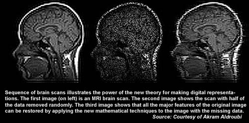 The new approach can produce some startling effects. In one exercise, for example, Aldroubi takes a large MRI image, shrinks it down to a small size and then expands it back to the same size as the original. The original and reconstructed images look almost identical, and a pixel-by-pixel comparison shows that only a minute amount of information has been lost.
