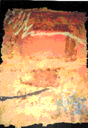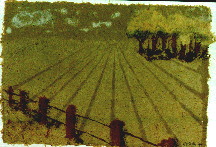 Fields of wheat, pulp painting made totally from plant fibre papers, wheat, cumbungi, oats, redhot poker,& birdsnest fern.