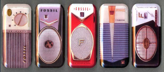 The five Fossil tins shown above are modified images of (left to right) the Sony TR-86 (p.26), Truetone DC-3090 (p.61), Realtone "Electra" TR-801 (p.80), Crown TR-555 (p.43), and an oddball "Selfix" (p.64)...