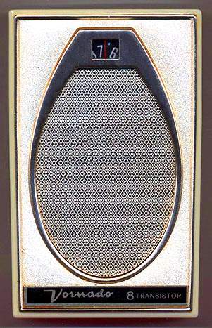 aka Realtone TR-1843, also an 8-transistor set, circa 1962 -- the Realtone cabinet also came in powder blue, and the brushed aluminum faces on many of these sets is a beautiful peach-gold color...