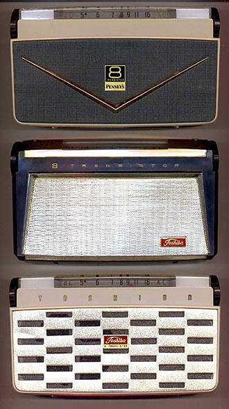 The M31 gallery of...1961 8TM-41, 1960 8TM-294B The Penny's version had a metal grill which was painted aqua -- and a painted grill is always an indication of going that extra mile... The (middle) 8TM-41 came out a year after the other two, but it looks like it should have preceeded them by a decade or more. The photo doesn't show it, but the 41's sliderule tuning dial could feel right at home on any 1940s US tabletop tube radio... All three models are 8-transistor radios. |