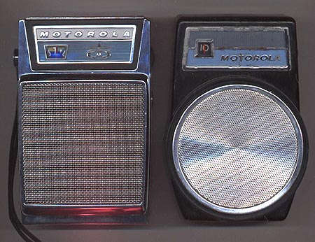 Right: Motorola X14 series: 6 transistors, 2 3/4 x 4 x 1 1/4. Hey buddy, a Realtone Comet you're not -- time to do something about that spare tire there...