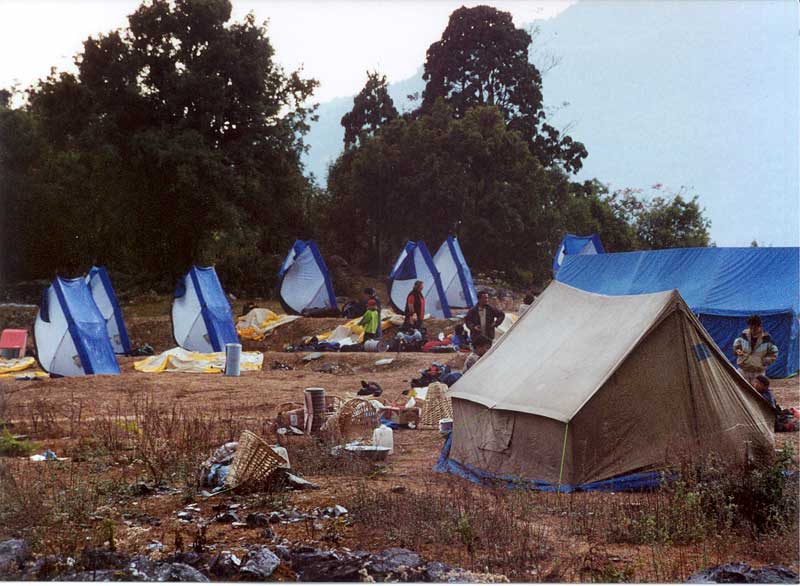 | 2nd night camp across the valley from Lespar at our camp near Chwai. It was very cold, but above freezing. The condensation in the tents got them all wet. Here we are trying to dry the tents by standing them on end facing the rising sun. It made for an unusal site. The brown tent in front is the cooking tent where our meals were prepared. The large blue tent is where we sat to eat dinner and breakfast. |