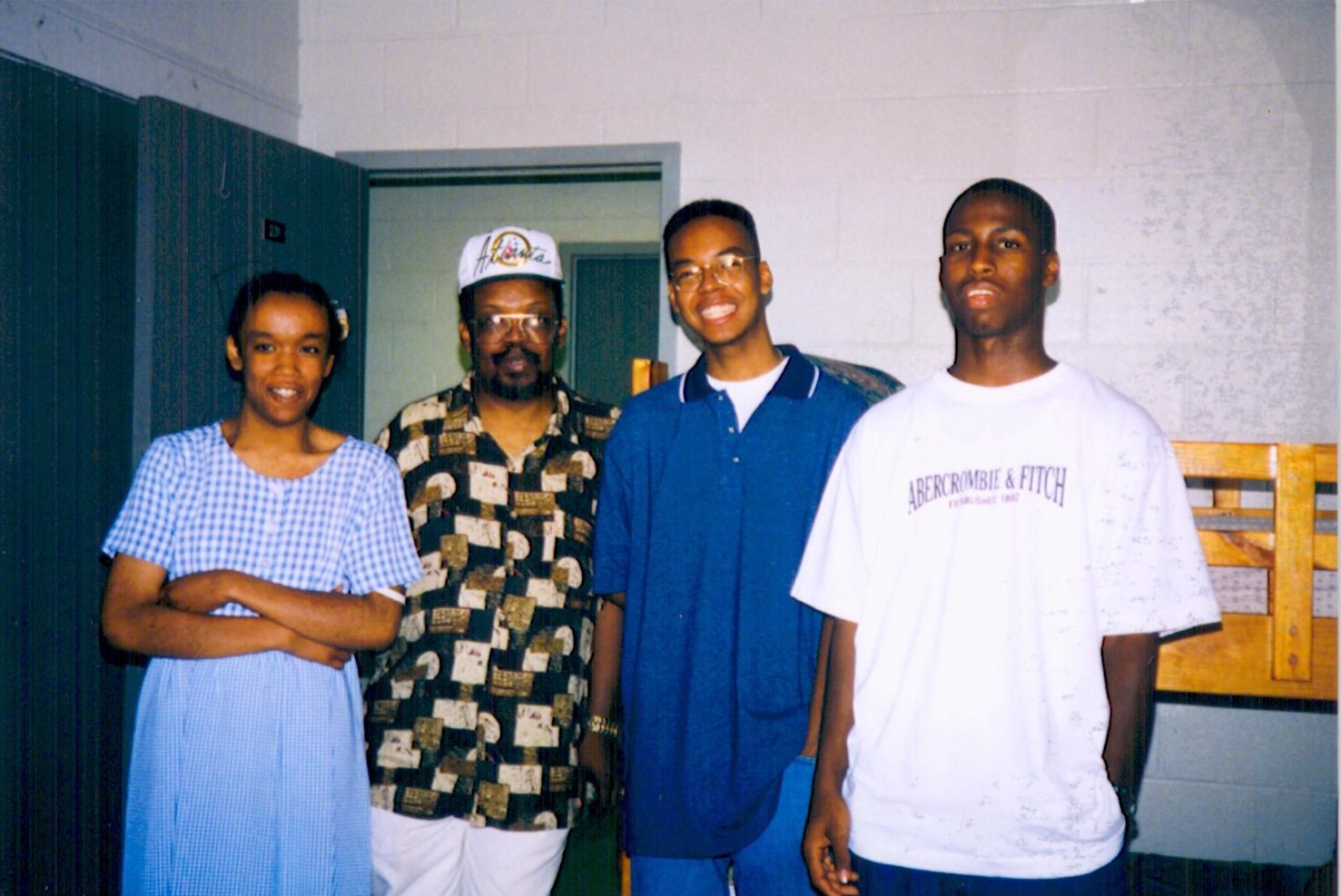 | My sis' Janice, Dad (Sr.), Me, and Deandre Freshman year in St. Mike's Dorm |