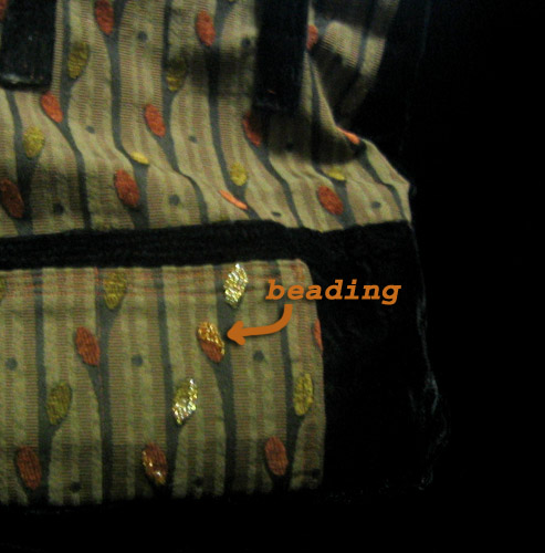 NOTE: The bead work shown here in the final image is an example, and this technique may be applied to many of our other bags as well. All additional decorative details such as beading will be factored into the cost of your bag.