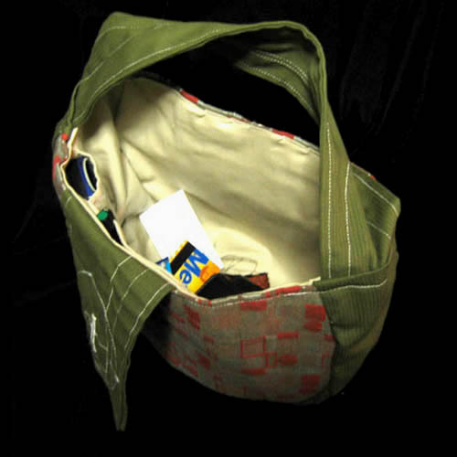 Verner Panton's arguably most famous textile design was called Geometri, and consisted of a repetitive circles-in-squares. Geometri provided the inspiration for both the textile pattern and the overall shape of this circular bag. The pattern of circles-in-squares is echoed in the circular shape, the square front cover, its circle-in-square stitching adornment, and finally the vintage silver-colored button. The orangey-red, camouflage-green and silvery-blue provide fabulous contrast. Like the other bags, the inside of this one is complete with cell phone and pen pockets.