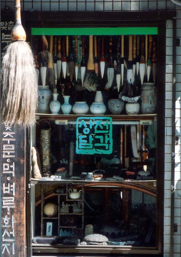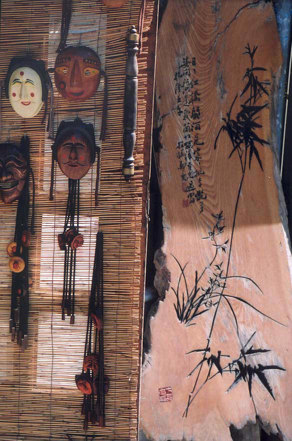 | .....Continued The shopkeeper introduces me to many of his pieces - " This is an old Japanese piece." he said, pointing to a pot. "And this?" I asked. "That is a new piece from China, I got it in Beijing last week." he replied. I was pointing to a very old looking paper and wooden lamp. " This is a very old chinese piece." The shopkeeper kindly informed me. His hand was pointing to a silk hat, whose once bright colours, were now dull with age. Back on Insadong, we glide through the slow moving river of people, eyeing what is on either side of the street and are struck all of a sudden by a change in the style of the architecture. We were now in the famed Mary's Alley, the name of the old part (and really the whole) of the street, before the name Insadong was officially sanctioned. Incidentally, the name Insadong stretches back to the Chosun dynastic period. In those days the street was much narrower than it is today. |