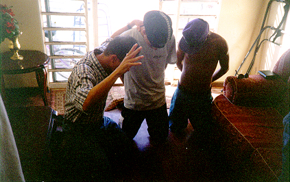 Os irmãos Mayco, Carlito e o primo Marcelo, como novas criaturas, nascidas de novo (Mayco 19 anos, no centro), tem dificuldades de se locomover, vítima de um tiro no pescoço, está se recuperando. Conversando com esses adolescentes,observamos que Mayco e Carlito (14 anos) sentem a ausência da mãe, refletida na escola, mas Deus já mudou isso , (foram adotados por Deus), deixando a condição de criaturas para serem chamados de filhos de Deus. Entregamos 3 bíblias e deixamos uma cesta básica. Glória a Deus por esta família. que começa a ser restaurada. Aleluia, Amém,