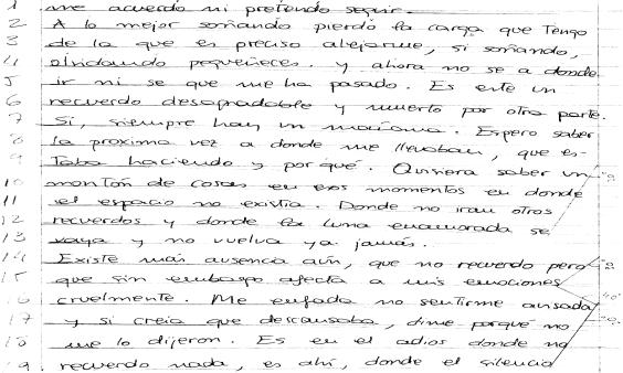 Tiene buena memoria de clasificación pues asocia ideas distintas y disímiles a lo largo del tiempo, aunque sufre en muchos momentos dudas sobre sus recuerdos y se fatiga demasiado. Así mismo, tiene buena memoria de conservación, pues sus ideas son claras, mostrando gran sensibilidad para matizar y distinguir unas cosas de otras.