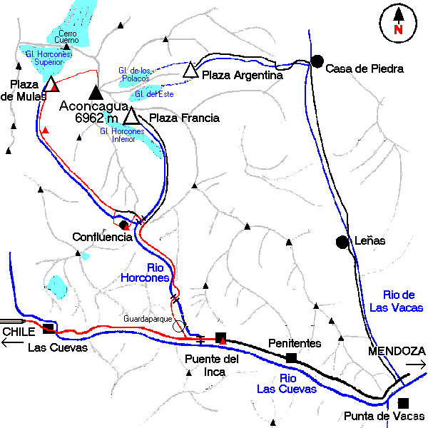 Descrizione itinerari di avvicinamento ai tre Campi base posti alle falde dell'Aconcagua