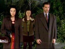 At the diner, Luke digs for dirt from Lorelai about Christopher. Could this be jealousy? Before he can get the lowdown, the conversation is cut short when the very man in question and Rory enter for a bite to eat. As they all sit, Emily calls on Christopher's cell phone and wants to talk to Lorelai. Christopher's folks are in town too, so Emily announces that they'll all be having dinner together! Both Christopher and Lorelai dread the idea of dinner, but they have no choice but to go.