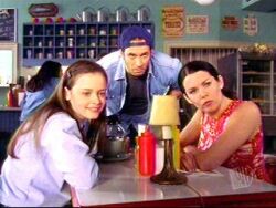 After Lorelai and Max secretly make a date for Saturday night, we find Rory and Lane outside Doose's Market, the place where Dean works. Lane went in solo for Rory, so she wouldn't have to see her floppy-haired ex-boyfriend. Heartache is successfully avoided when Lane announces that Dean wasn't even working that day. So, now Rory can mark down the day in her little calendar, you know, the one containing all the places and times where Dean will or won't be. Even though she at first pretends such a calendar doesn't exist, Rory can't hide the truth from her best bud and in fact, is grateful that Lane gave her the lowdown. Now, Wednesdays are safe at Doose's.