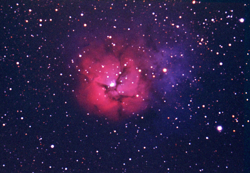 Object Information: M20 (NGC 6514) is a diffuse nebulae called Trifid Nebula and got its name from the three dust lanes, which divide the nebula into three separate regions which intersect near its center. The structure which will bring out the three dark lanes familiar on photographs can only be seen with large telescopes. Small scopes just show the bright stars in the heart of the nebula .The Trifid Nebula as you can see in wider photographs is found 1.5 degrees north of the Lagoon Nebula in the constellation Sagittarius. Stars, the Sun included, were born within clouds of dusty gas such as the Trifid Nebula. The light from M20 we see today left perhaps 3000 years ago, although the exact distance remains unknown. Measuring some forty light years across, this nebula contains enough gas to make many thousands of suns. Within it a number of young hot stars have already formed. The hottest cause the interstellar hydrogen gas, to emit its characteristic red light. Around the red emission nebula the gas contains many dust grains which preferentially reflect the blue component of starlight, and to the north (top) of the nebula can be seen a bright star which illuminates part of the dust to create a region of blue reflection. In some parts of the nebula there are so many dust grains that they hide the glowing gas, producing the three dark lanes which give the object its name.