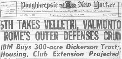 Poughkeepsie New Yorker Poughkeepsie, N. Y., Friday, June 2, 1944 Price 5 Cents IBM Buys 300-acre Dickerson Tract; Housing, Club Extension Projected Land Holdings Now 638 Acres $40,000 Price Indicated in Deal [information in brackets was hard to read or unreadable from copy from film] Extension of its Country club holdings and Post-war housing for its employes are planned by the International Business Machines corporation with its acquisition yesterday of the 300-acre Dickerson property in the South road, it was learned today. A deed conveying the additional recreational and housing tract to the IBM from Frank S. and Madeline Dickerson was filed in the County Clerk's office yesterday afternoon. Stamps on the papers [transferring the property to the IBM indicated that the purchase price was in the neighborhood of $40,000. Ronald F. Bogle represented the Dickersons in the transactions. John B. Van De Water was attorney to the IBM; and Ernest I. Hatfield local real estate dealer handled the [deal.] The [extensive] rear portion of the property is contiguous to the former Miller Farm of 123 acres, which was acquired by the IBM in 1942. This tract which was owned by Mr. and Mrs. Theodore H. Miller, and adjoins Kingwood Park property, was acquired for recreational purposes. A nine-hole golf course on this tract will be opened for the use of IBM employes next month. Plans Outlined From Charles A. Kirk, vice president in charge of manufacturing, it was learned today that the additional 300-acre tract was acquired by the firm "for extension of the Country club and Post-war housing for IBM employes." Mr. Kirk also made known that the plans are being advanced for the enlargement of the nine-hole golf course to an 18 hole course, all within the 123-acres tract acquired from the Millers. With regard to housing for the IBM employes, Mr. Kirk confined his report at this time to the fact that IBM does contemplate the post-war construction of dwellings for its employes on the acreage which was acquired yesterday. By the purchase of the Dickerson property, the IBM has increased its total holdings in the Poughkeepsie area to 638 acres. The original purchase was that of the former 215-acre Rudco property, bordering along the South road and Rudco road, and containing the corporation's Plant No. 4. With the purchase of the 123-acre Miller farm to the southeast of the Rudco tract, and yesterday's acquisition of the Dickerson place, the total holdings have been increased to 638 acres. All of the recreational and post-war housing property of the IBM is east of the Post road, the Plant No. 4 site being entirely on the west side of the main highway and extending to the river. While the greater p art of the north line of the Dickerson property adjoins the former Miller farm, the South road frontage of the additional IBM parcel is not contiguous to the former Miller property. Smaller South road frontage properties in between the former Miller property and the Dickerson property are those of the VanScoy's, the Daley's and the Mullaly property, the last-named in an unimproved lot. Tract of Historical Interest Held by the Dickerson's since 1911, the new IBM tract reflects local historic interest. The 12-room Dickerson home is of Dutch Colonial design and was believed built in the early part of the 18th century. An early occupant, if not the original owner of the home, was Abraham Fort, who with his wife, Jane, was know to have occupied the premises in 1778. The Casperkill, originally known as Jan Casper's Kill, flows through the property. The stone house contains two Dutch colonial fireplaces. The transferring papers indicate that the larger portion of the Dickerson property was that of the former Fort farm, and that the smaller portion was held in the Westervelt family. Excepted in yesterday's transfer was a 25-acre strip of property on the east end of the premises which was acquired by the LeRoy family. Much of the acreage acquired by the IBM in wooded. Under the terms of the deal, the Dickersons are allowed to retain possession of the house for six months with no rental charged them. Mr. Dickerson said that he is looking for a new home. Mr. and Mrs. Dickerson have two children. Their son, Captain Frank S. Jr., is stationed with a field artillery unit in Kansas. Their daughter, Virginia, a graduate of Vassar college, is director of laboratories at the Peter Brent Brigham hospital at Boston. Earlier plans for the development of the IBM recreational holdings called for the construction of tennis courts and a baseball diamond as well as a clubhouse. Robert Trent Jones, New York architect who specializes in preparing plans for and developing golf courses, was engaged to direct and supervise the construction of the nine-hole course. Thomas J. Watson, president of the IBM, [ - - - - - - -personal interest] in the development of the recreational facilities. The acquisition of the additional recreational and housing tract by the IBM reinforced Mr. Watson's previous public statements indicating the permanency of the plans for Plant No. 4 of the corporation. Last February, Mr. Watson, in a general statement concerning all IBM plants, said that "we have begun to train our Poughkeepsie people for the manufacture of peacetime products." Then in general comment with regard to IBM's plans, he added: "New things will be coming out of laboratories which we are planning on to keep our people employed after the Allied victory." Joseph P. Foley, president of the board of governors of the IBM Country club, confirmed reports that the official opening of the nine-hole golf course is planned for next month. "We are not sure of the opening date," he said. Foley is an employe of the production control division of the plant. |