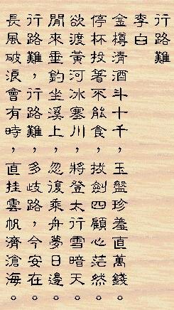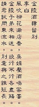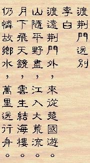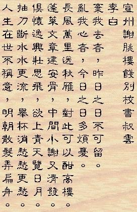 李白 宣州謝朓樓餞別校書叔雲 棄 我 去 者,昨 日 之 日 不 可 留; 亂我 心 者,今 日 之 日 多 煩 憂。 長 風 萬 里 送 秋 雁,對 此 可 以 酣 高 樓。 蓬 萊 文 章 建 安 骨,中 間 小 謝 又 清 發, 俱 懷 逸 興 壯 思 飛,欲上 青 天 覽明 月。 抽 刀 斷 水 水 更 流,舉 杯 銷 愁 愁 更 愁。 人 生 在 世 不 稱 意,明 朝 散 髮 弄 扁 舟。 |