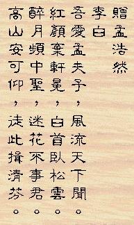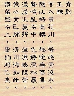 下終南山過斛斯山人宿置酒 李白 暮 從 碧 山 下,山 月 隨 人 歸; 卻 顧 所 來 徑,蒼 蒼 橫 翠 微。 相 攜 及 田 家,童 稚 開 荊 扉; 綠 竹 入 幽 徑,青 蘿 拂 行 衣。 歡 言 得 所 憩,美 酒 聊 共 揮; 長 歌 吟 松 風,曲 盡 河 星 稀。 我 醉 君 復 樂,陶 然 共 忘 機。 |