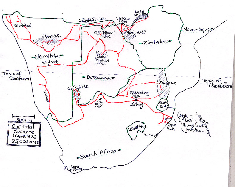 * Our next adventure was the obscure, rarely travelled "hunter's road". It is a road in name only. It starts out as an elephant trail (single file) and finishes 200km further north following a grown over cut line between Botswana and Zimbabwe.We cannot recall seeing the "No Unauthrozed Entry" sign. As we bashed along in first gear our wheel-wells became coated in elephant dung. Elephant trails abounded, we heard elephants breathing at night but in 4 days we did not see a single one of Botswana's 120,000 jumbos. This is akin to wandering the streeets of London for 4 days and not seeing a single doubledecker bus (transit strike?).