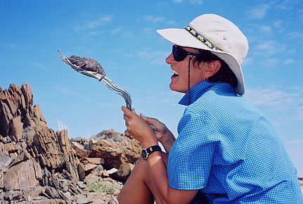 * The wonderful Molopo Game Reserve was our first major stop. Few people have heard of or visited the reserve (250 km north of Vryburg on the Botswana border). This remote southern Kalahari reserve is an arid savannah region of grass and thorn trees with plenty of game. The camping was superb and we did not meet another vehicle while driving the sandy tracks over 8 days. Our desire to roam the grasslands on foot was tempered by an encounter with an angry, vocal puff adder and later an impressive irritated yellow cobra. "Ladies first. No you first!"