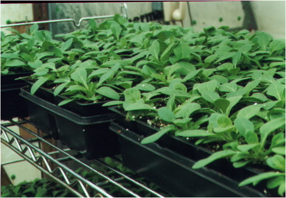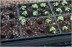 | Plugs are an easy way to propagate plants.Plugs or liners are produced by specialty growers who start the plants then ship then out to be finished off by the grower. Plugs come in a variety of different sizes depending on the plant materiel and the time the grower wants to spend finishing them off. A 512 tray would have 512 plants ready to be placed in cell packs or pots and grown on.These plants would be very small and take the longest time maybe 6 to 8 weeks. A 288 tray would have larger plants and would take maybe only 4 weeks to finish off. A 70 tray is usally used for perrienials or larger landscape plants that will be grown on for the next years sale. There are several good reasons to buy plants as plugs. First the plugs are already to be placed in to cell packs or pots and save a lot of time and labor. Second overhead costs are reduced because the plants do not have to be in a heated greenhouse for as long a period. In the case of a crop failure plugs could supplement a production shortage. | |||||||||||||||||||||||||||||||