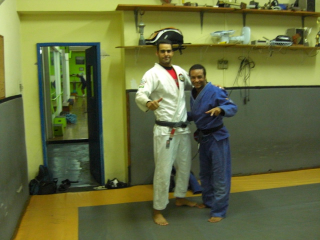 | Marcelo Cazuza (left) and Diangelo. Seen through the door, a smooth wooden floor, perfect for Sensei Fred's karate classes. Jiu-Jitsu guys are not arrogant. Every style is cool with them. Do what pushes your personal buttons, they say. Personally, they like jiu-jitsu. |