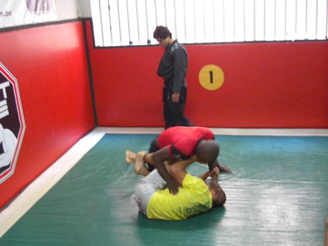 | Ricardo Vieira supervising training sem-quimono (Brown belt Alexandre in red on top). Notice how Alexandre controls opponent's face. |