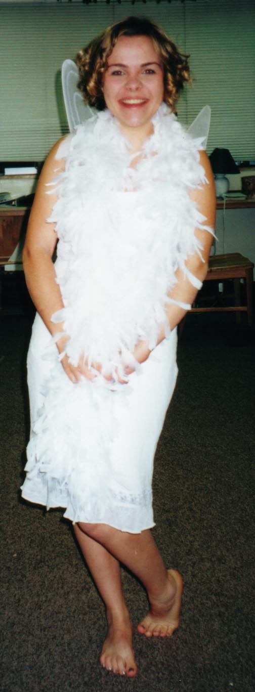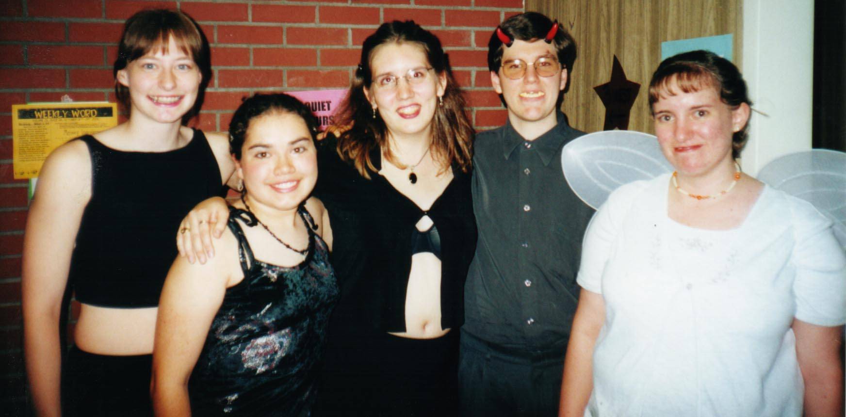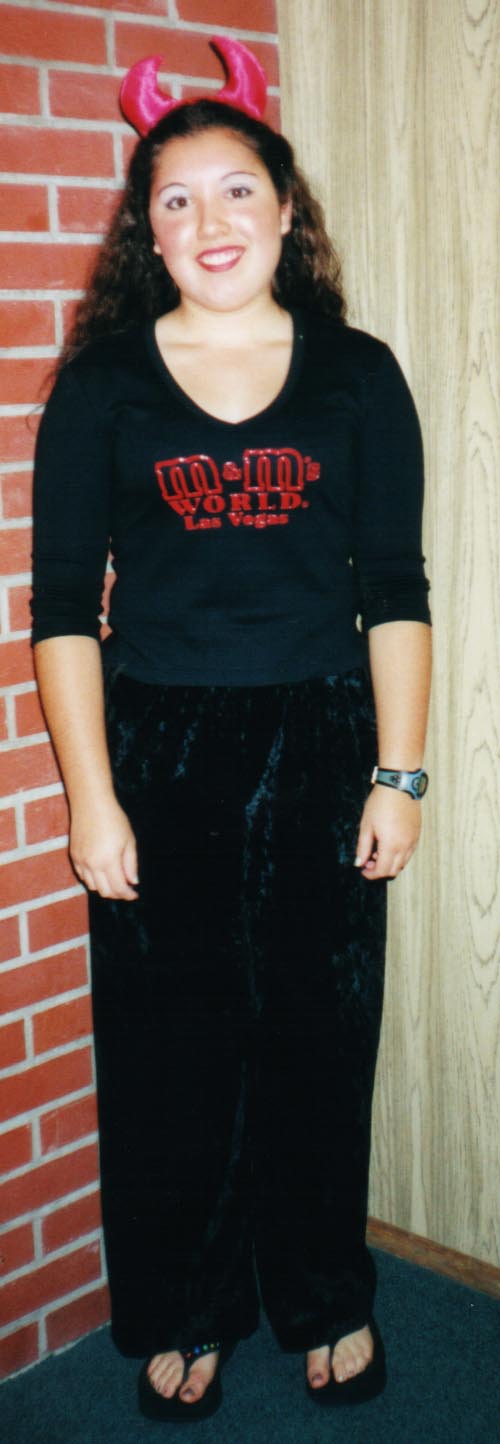 | The Rainbow Rage theme was Heaven and Hell--the dance was actually split between the SUB foyer (hell) and the SUB ballroom (heaven). (Hell seemed a lot more packed... hmmm...) Also, some people dressed for the theme. Here we have my beauteous sister Cynthia modeling her 'devil' attire, and my lovely sectionmate Linnea showing off her adorable 'angel' costume. I had been a little worried about taking my sister to a loud, rowdy college dance with scary things like freak dancing and guys in drag *gasp!*, but she actually enjoyed herself almost more than I did. Go figure! ;-) |