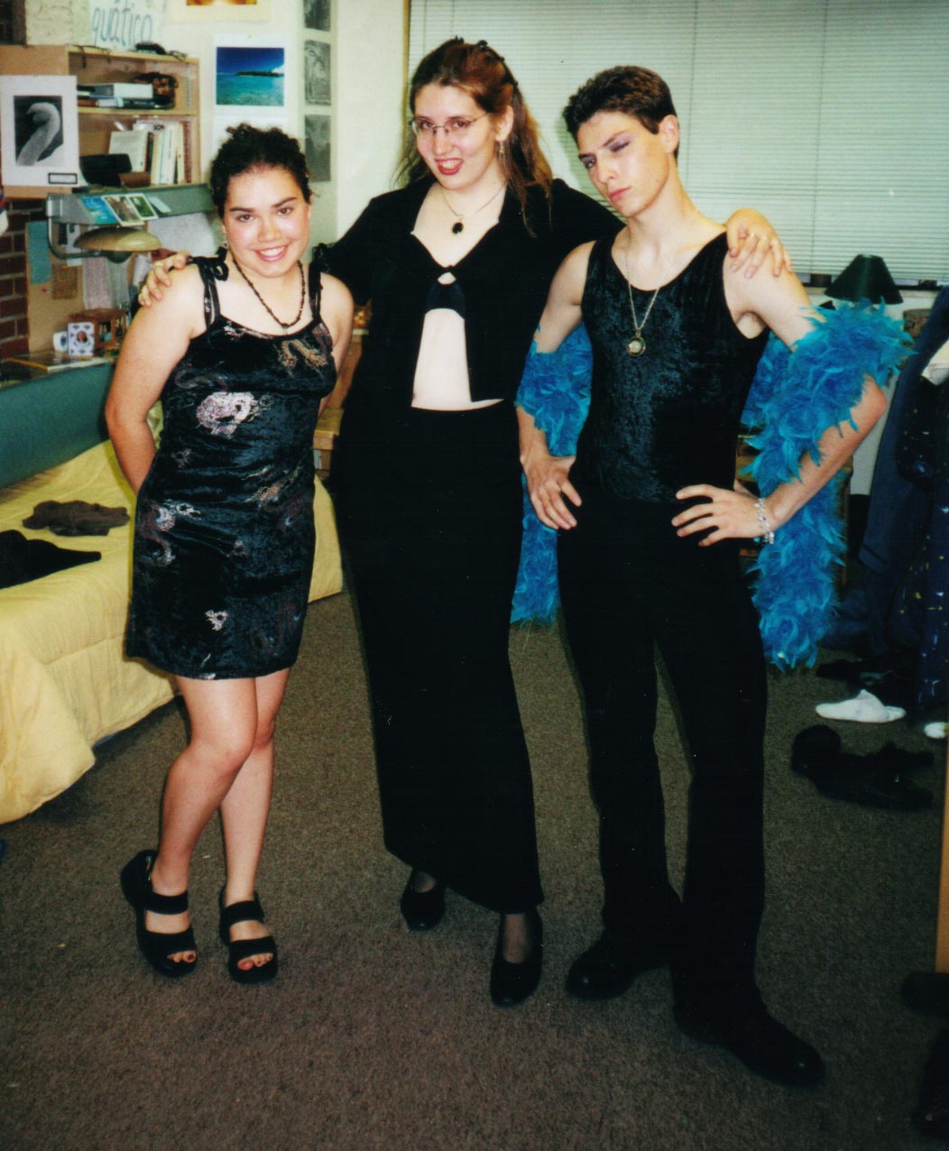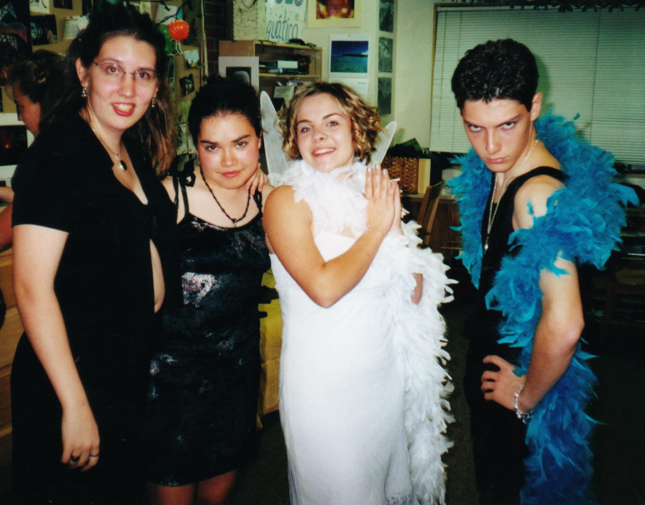 | Here we are all dressed up for the dance. Ben went "glam-rock" and the general consensus was that he looked "damn hot." Dani went as Dante, her favorite poet. Laura and I just ended up showing a lot more skin than either of us are used to... |