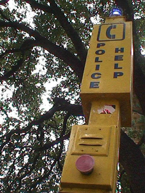 Auxilio: Austin es básicamente un lugar seguro, pero de vez en cuando se pasean tipos medios sicópatas por el campus por las noches, y para esos casos se ocupa esto: una alarma automática, que si te hicieron algo, vas, apretas el botón y llegan los pacos al instante. Supongo que suena una sirena y se activa la baliza, pero ni idea porque nunca he visto una funcionando. Están en todas partes, eso sí.