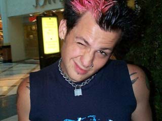 | Name: Benji, Benjahole, Kid Vicious Birhtdate: 3/11/79 Hometown: Waldorf/Naptown, MD Age:22 Height:5'7 Hair: Black spikes w/ pink spot and some blue too..... Eyes: Brown Part in GC: guitarist and back-up vocals Attire: Bondage pants/shorts, East Coast Clothing, Chuck Taylor's, Band Tees Movies: Sid and Nancy Another State of Mind Music: Minor Threat, Government Issue, Social Distortion, Sid Vicious, Ben Lee, Beastie Boys, Everclear, The Clash, Rancid, Green Day Some of his favorite things: 63' Chevy Impala, people watching, free food, goth girls, girls with tattoos and piercings, cashdog, punk shows |