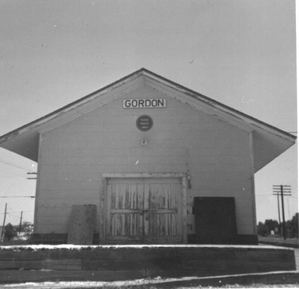 | Gordon Rail Road Depot The Gordon Depot, along with the rail road was a vital part of the community for many years. It played a key role in Gordon's large cattle and cotton industries. It also served the community as a means of extended travel by train. Below is a shot of the depot as it was being moved out of town in the 1960's. |