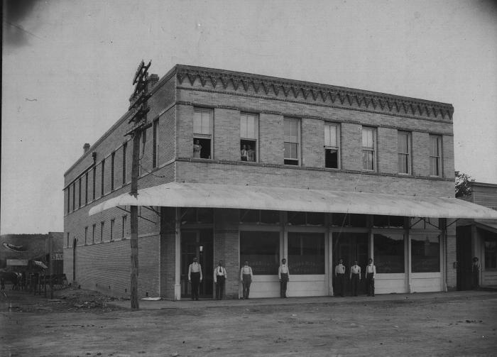 | Eaton and Blewett General Mercantile The Eaton and Blewett store handled various things. It handled horse drawn buggy to Ford vehicle sales. It was a general mercantile business. It was also known to have handled morgue responsibilities. This building was located where the present day Stowe Ford lot is. |