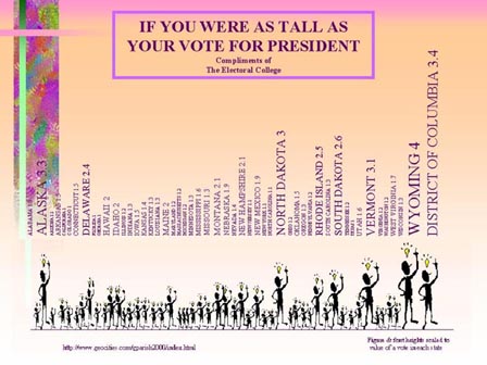 Because of the rules of the Electoral College, there are great disparities in the relative influence of a person's vote for President cast in different states . In a democracy or a republic you would think that a vote cast by a person in one state should be equal to a vote cast by a person in another regardless of what state he lives in or his race, ethnic heritage or religion. Sadly, this is not so. Would you believe that a vote cast in Alaska is worth about four votes cast in Florida? Or that a vote in Texas is worth only a third as much as a vote in Vermont? However, this is no laughing matter. If Americans are not equal at the ballot box, they are not equal under the law. |