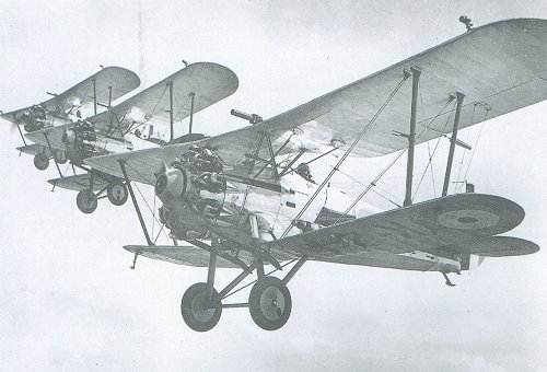 | A flight of Bulldog fighters. The Bulldog was usually armed with 2 synchronised Vickers machine guns or 4 x 20lb bombs. |