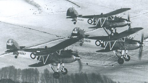 | A flight of Fury II's used as Trainers after the introduction of the new monoplane Hurricane fighter. The Fury was soley employed as a day fighter and was fitted with 2 x 0.303 Browning machine guns. The Fury equipped 6 RAF squadrons. |