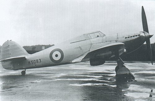 | The Hurricane I prototype K5083. First flew on 6th Nov 1935. The first proper RAF monoplane fighter. |