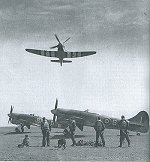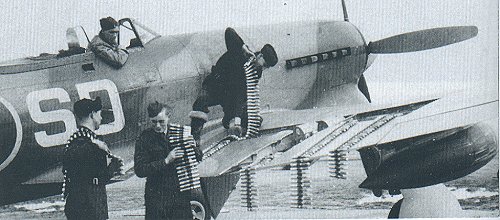 | A litle bit grainy this photo, but it shows the rearming of a Tempest V. The wing plates above the two 20mm Hispano cannons are off and the 20mm ammunition belts are being fed into their bays. The cannons were eventually completely bedded into the wing to reduced any drag effect, but the new shorter Hispano V series were prone to jamming. |