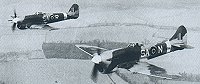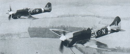 | A grainy picture this one, but it does show the differences between the Typhoon (background) and Tempest (foreground). Notice the difference in tail units and protruding length of the 20 mm cannons. |