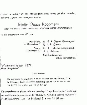 | Trijntje Oeges Koopmans | 6-4-1971 | 's Graveland | overleden |