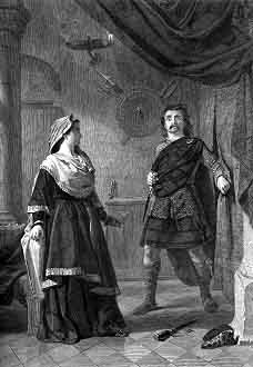 | Act 1, Scene 5, Lines 38- 53 The raven himself is hoarse That croaks the fatal entrance of Duncan Under my battlements. Come, you spirits That tend on mortal thoughts, unsex me here, And fill me from the crown to the toe top-full Of direst cruelty! make thick my blood; Stop up the access and passage to remorse, That no compunctious visitings of nature Shake my fell purpose, nor keep peace between The effect and it! Come to my woman's breasts, And take my milk for gall, you murdering ministers, Wherever in your sightless substances You wait on nature's mischief! Come, thick night, And pall thee in the dunnest smoke of hell, That my keen knife see not the wound it makes, Nor heaven peep through the blanket of the dark, To cry 'Hold, hold!' |